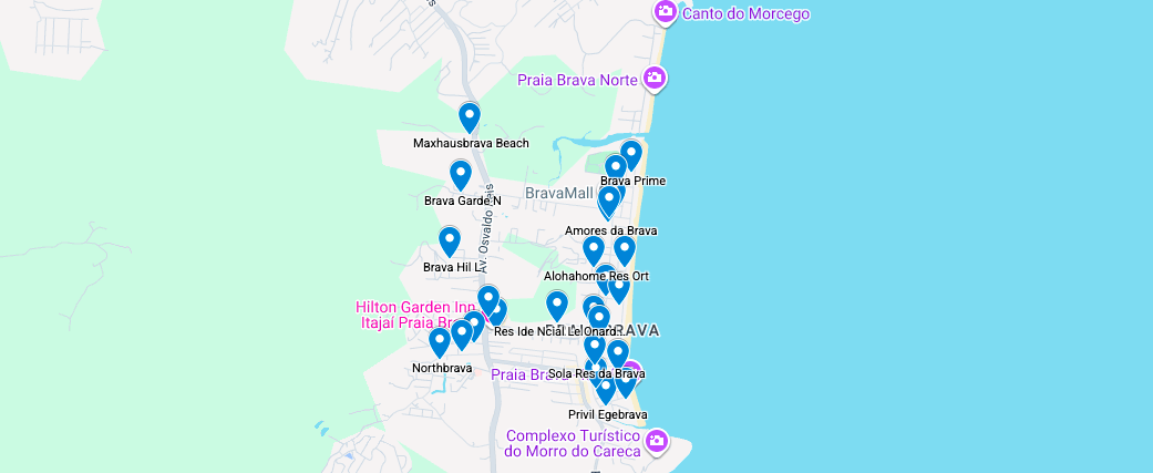 O mapa abaixo reúne edifícios localizados no Centro, Barra Sul, Pioneiros e Praia Brava, permitindo explorar os prédios por região e entender melhor a distribuição geográfica dos empreendimentos.